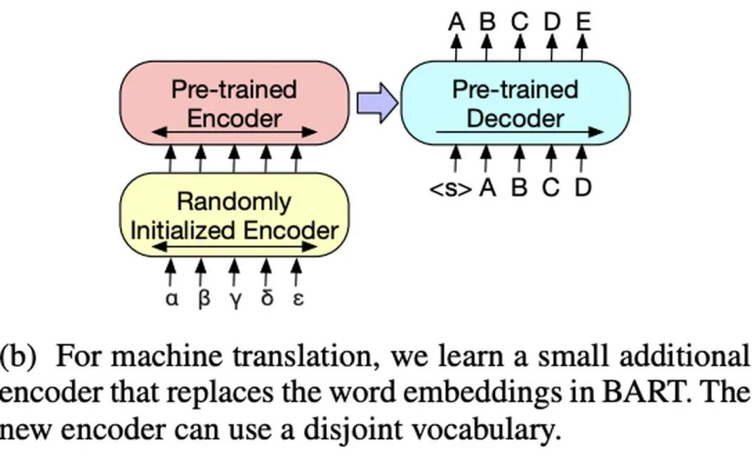 Machine Translation:新增了一个 Encoder 结构(随机初始化),视作对预训练 Encoder 的 embedding layer 的替换