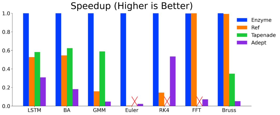 通过优化微分后的代码,Enzyme 可以比现有的优化工具提供更快的微分速度: