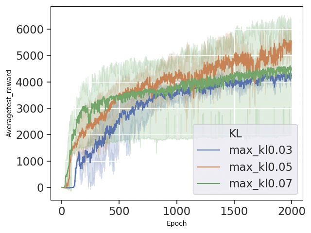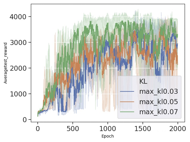 这里主要调节每次 early_stop 的 max_kl,采样 3 个随机种子完成实验。