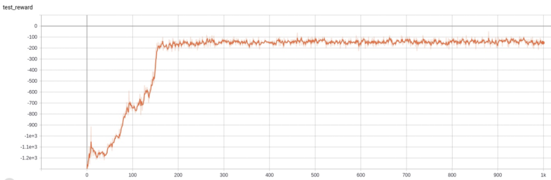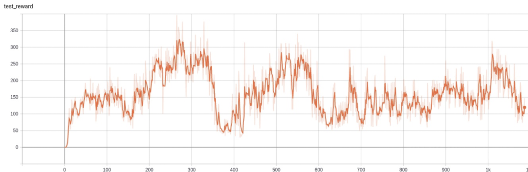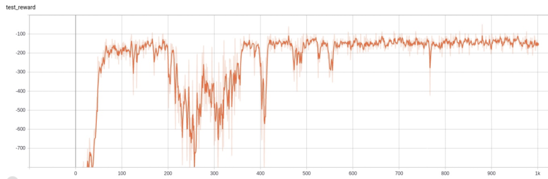 算法并没有很好的学习,reward 在 100 iter 以内还有上升趋势,100iter 时突然下降,之后就再也起不来。