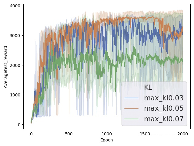 在 walker2d 环境中,kl0.07 的效果却是最好的,这也说明在不同的任务环境中,超参数的选择也是不同的。