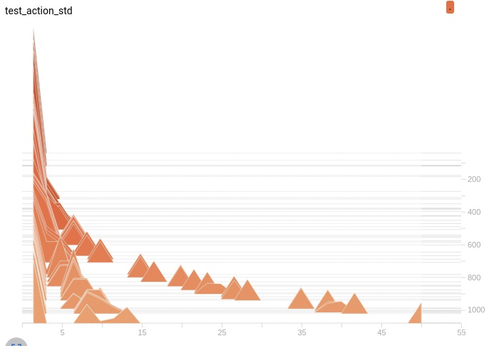 查看 Actor 网络动作 std 的变化情况,由一开始设置的 1 越变越大,也正是如此导致了 entropy 的不降反升。