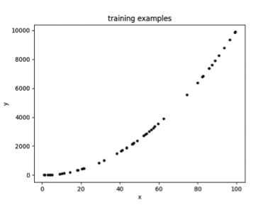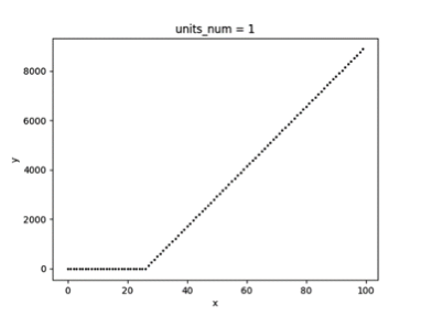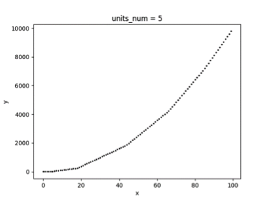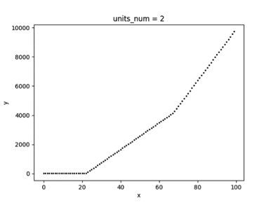 以下一个简单的例子展示了以 ReLU 为激活函数的单隐藏层神经网络模型,其拟合效果与隐藏层单元数量的关系,为了方便可视化,拟合的目标是一元二次函数(x>0)。图 3.1 为随机采样的 50 个样本,图 3.2、3.3、3.4 分别为隐藏层单元数量取 1、2、5 时的拟合曲线。