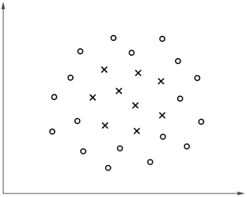 一个可行的办法是增加高次方项作为特征输入,比如以 作为线性 SVM 或逻辑回归输入,可以拟合形如 的决策边界(实际上它可以拟合圆或椭圆),对于图 1 所示的例子这可能是不错的模型。