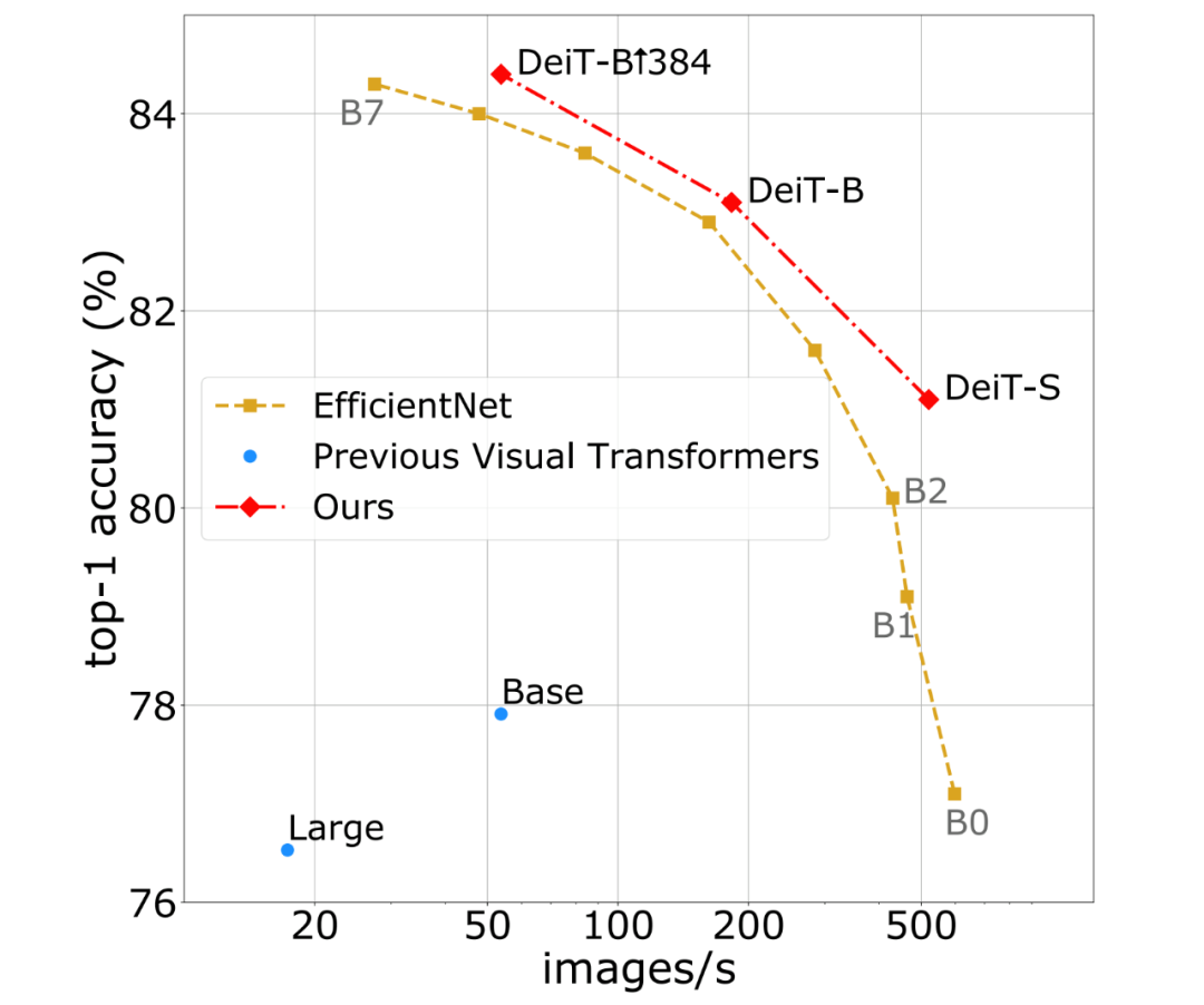 该研究提出的方法(DeiT 和带蒸馏的 DeiT)与以前的视觉 Transformer 模型以及 SOTA CNN 的性能曲线对比,这些模型均在 ImageNet 上训练而成。