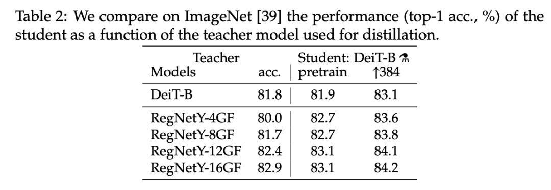 实验发现,使用 Convnet 做教师网络的性能要优于使用 transformer。下表 2 对比了使用不同教师架构的蒸馏结果: