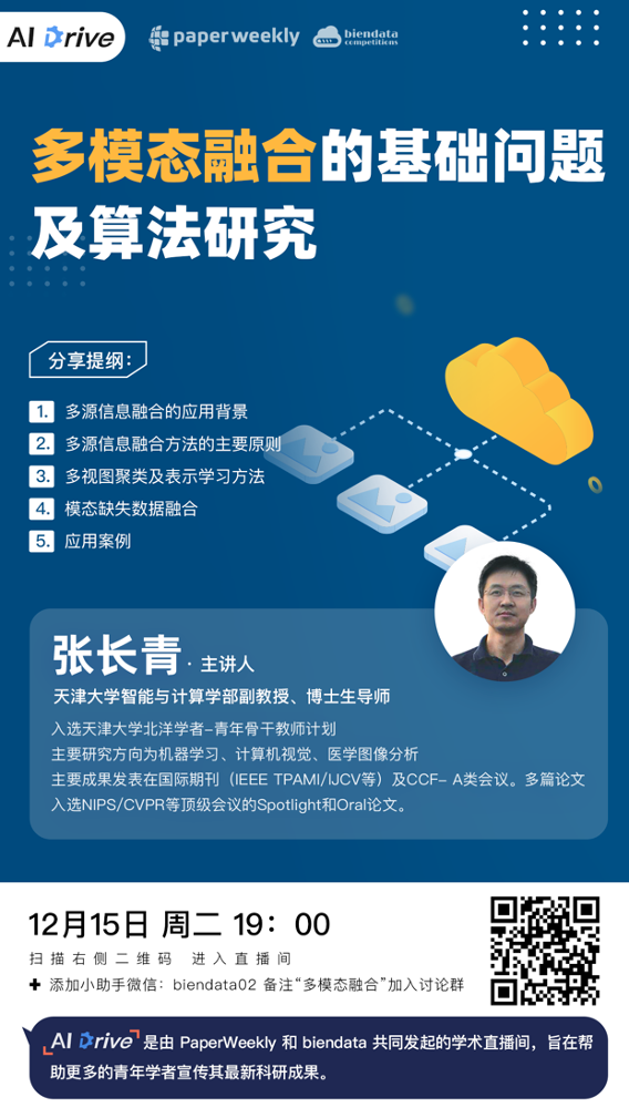 本期 AI Drive,我们邀请到天津大学智能与计算学部副教授、博士生导师张长青,为大家带来多模态融合的基础问题及算法研究的专题直播。对本期主题感兴趣的小伙伴,12 月 15 日(周二)晚 7 点,我们准时相约 PaperWeekly B 站直播间。