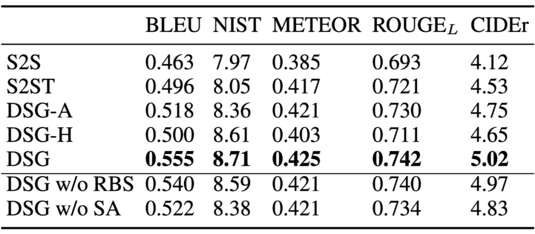 下表是主要实验结果,我们对比了一些常见的生成模型,其中 S2S [4] 采用基于 LSTM 的 sequence-to-sequence 模型,而 S2ST [3,5] 则是基于 Transformer 的生成模型,DSG-A 和 DSG-H 则是分别采用 Attention Adaptor 和 Hard Adaptor。
