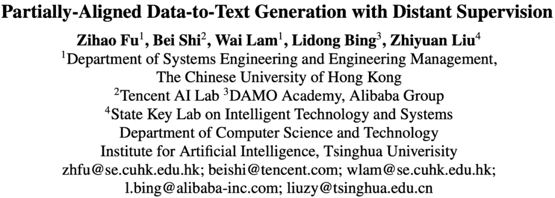 [2] Partially-Aligned Data-to-Text Generation with Distant Supervision. Zihao Fu, Bei Shi, Wai Lam, Lidong Bing, Zhiyuan Liu. EMNLP, 2020.