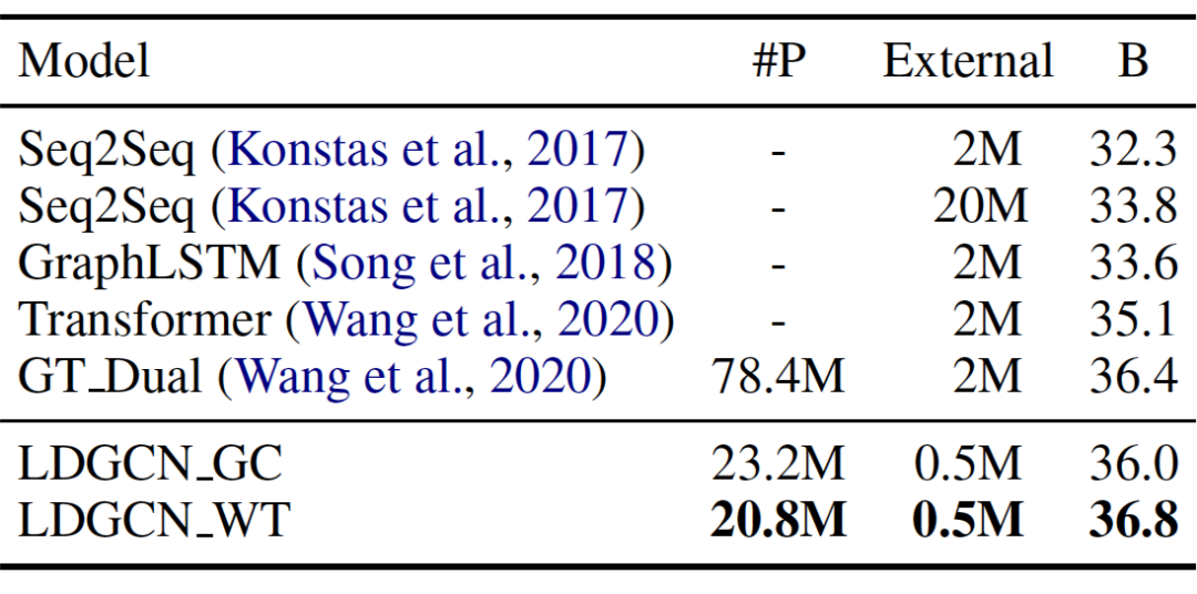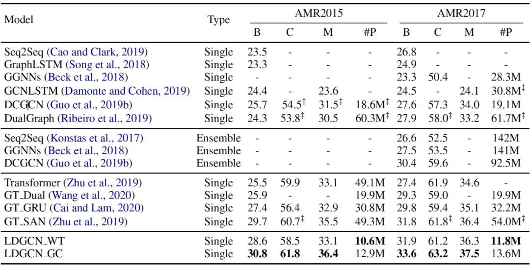 基于不同的参数共享机制,我们分别命名为 LDGCN_WT(Weight Tied)和LDGCN_GC(Group Convolution)。我们主要在两个标准的 AMR 数据集上进行了实验, 即 AMR2015(LDC2015E86)和 AMR2017(LDC2017T10)。