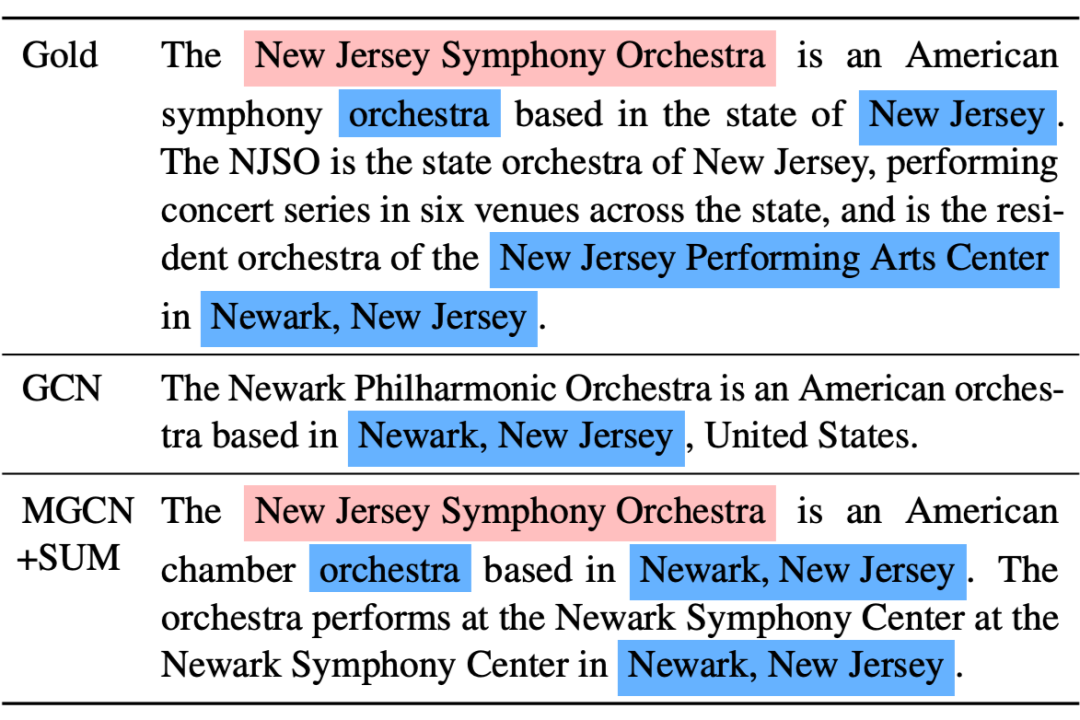 上图展示了知识驱动文本生成的例子。红色高亮文本是主要实体,蓝色高亮文本是附属主题实体。与维基百科的参考文本相比,我们提出的多图卷积神经网络与聚合运算能够准确捕捉到主要实体以及大部分附属主题实体。而传统的图到序列生成模型未能识别出主要实体。这进一步体现了传统图到序列模型会造成信息丢失的情况,同时也体现了多图卷积神经网络对于提取重要信息的有效性。