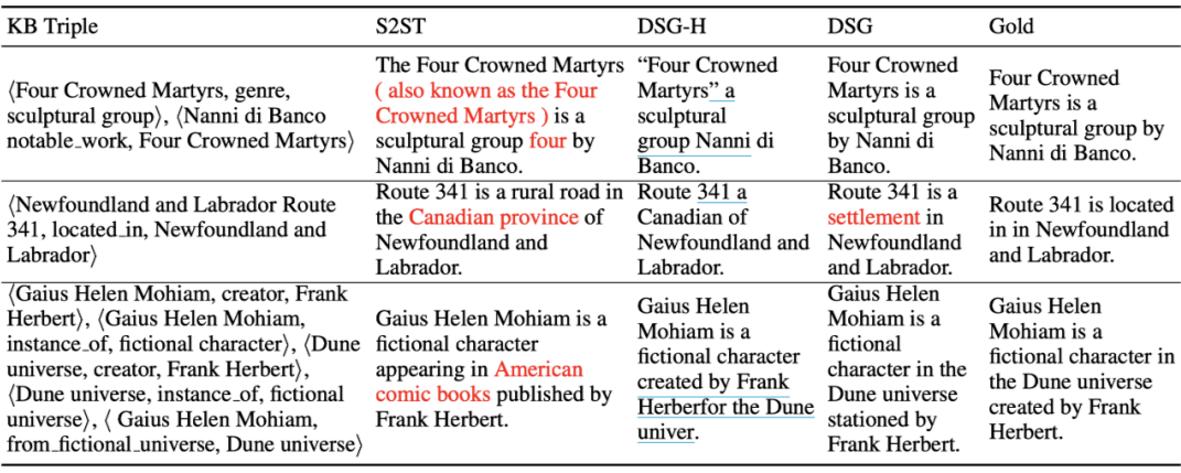 在图中,文本中红色的部分是三元组中未包含的信息,普通的生成模型会错误地认为这些信息是由给定三元组的某些部分给出的,因此,在使用训练好的模型做生成时,给定一些数据,它会生成额外的未提及的信息。