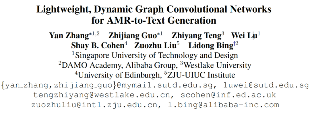 [3] Lightweight, Dynamic Graph Convolutional Networks for AMR-to-Text Generation. Yan Zhang, Zhijiang Guo, Zhiyang Teng, Wei Lu, Shay B. Cohen, Zuozhu Liu, Lidong Bing. EMNLP, 2020.