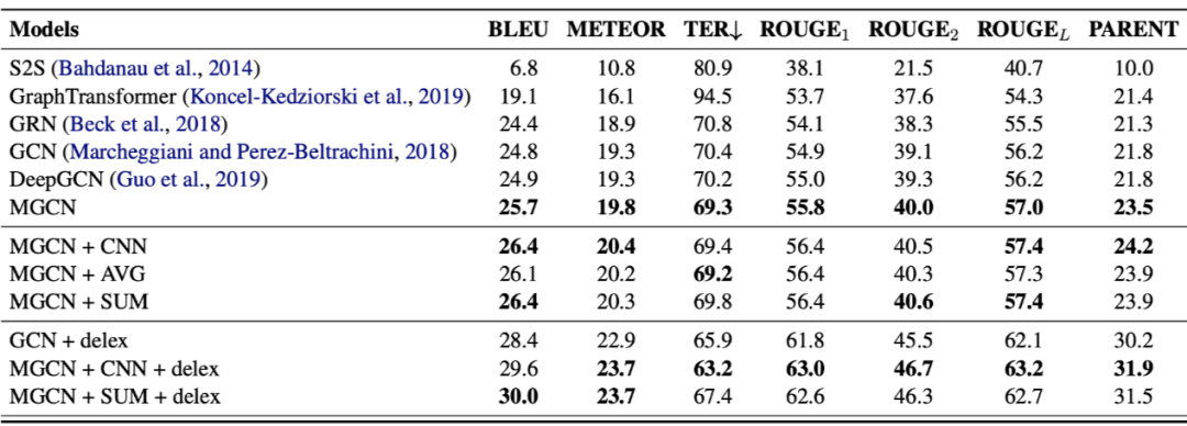 由此可见,我们提出的多图卷机神经网络的模型有效地捕捉了知识图谱中的重要信息并进行了有效聚合。我们进一步对数据进行了归一化处理(delexicalization),实验结果均有更进一步的提升。