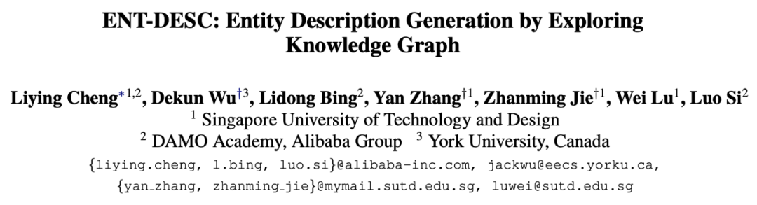 [1] ENT-DESC: Entity Description Generation by Exploring Knowledge Graph. Liying Cheng, Dekun Wu, Lidong Bing, Yan Zhang, Zhanming Jie, Wei Lu, Luo Si. EMNLP, 2020.