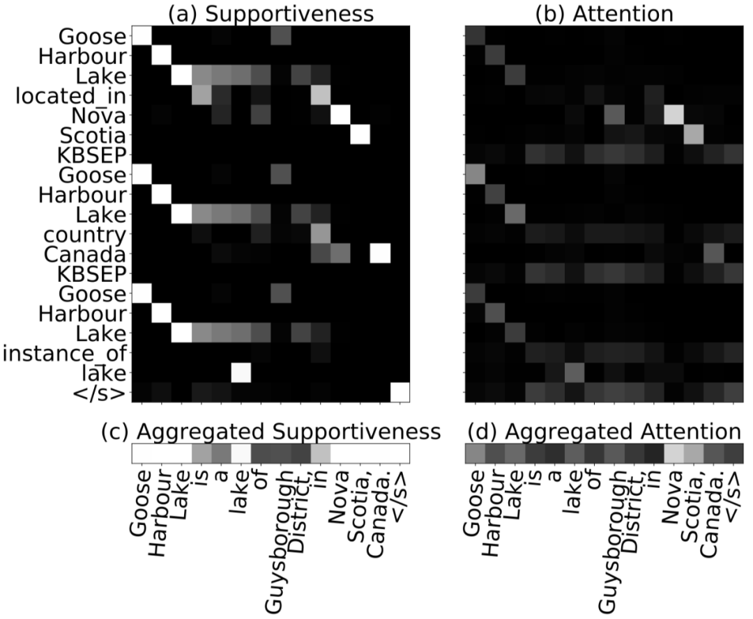 下图是对比了我们的支持度和传统注意力值的热力图。我们可以看到,因为注意力机制本身有归一化的约束,导致了一个词的支持度之和是固定的,这样,如果有很多词支持,就会分散支持的权重,因而我们的支持度计算方法比直接用注意力当支持度能更好地反应支持度的强弱。