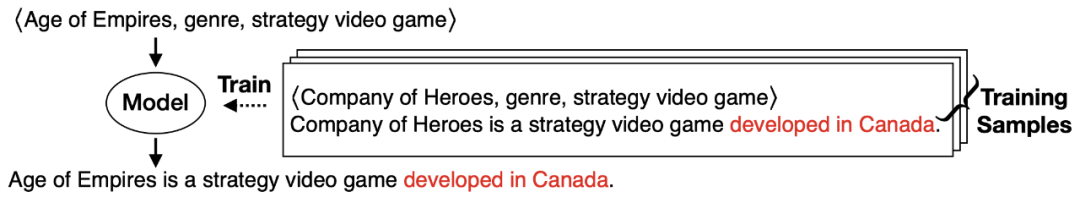 然而,这种自动标注的数据并不是严格对齐的,如图所示,因为很多信息 Wikidata 中并不包含,所以文本会包含比三元组多的信息。直接使用此类数据来训练现有的模型会导致过度生成的问题(over-generation)。
