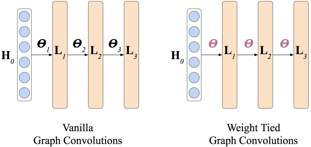 启发于最近的权重绑定自注意力网络 [4],我们提出了权重绑定图卷积。如上图所示,在权重绑定图卷积中,每一层都使用相同的参数。从而较大地节省了模型的参数。