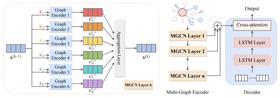 在多图编码器(Multi-Graph Encoder)中,不同于传统的图编码器,我们叠加了多层多图卷积神经网络。每层多图卷积神经网络的结构如左图所示。我们先将输入图嵌入转化为 6 个不同图的邻接矩阵,分别放入 6 个图编码器,以此得到 6 个包含不同类型信息的图嵌入。继而将这些图嵌入进行聚合运算,得到下一层的图嵌入。