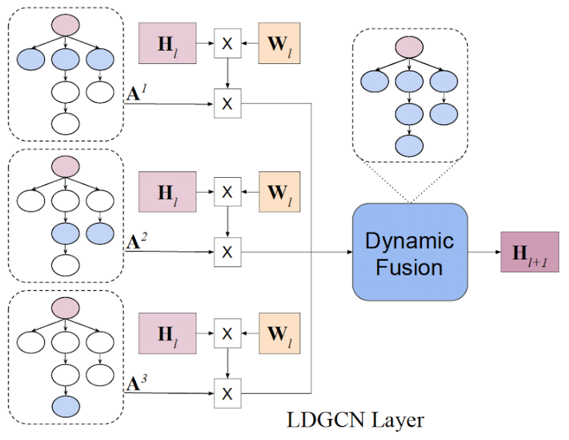 基础模型层面,本文将介绍我们提出的轻量、动态图卷积网络 (Lightweight, Dynamic Graph Convolutional Networks),简称 LDGCN [3],可以有效的融合图结构中来自不同阶节点的信息,进而学习更优的图表示,并提升下游文本生成的效果。