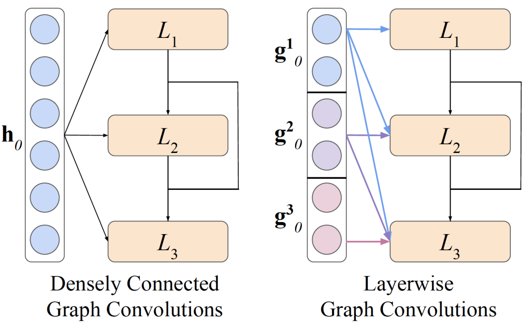 层级图分组卷积是基于最近的密集连接图卷积网络 [3] 提出的。如上图所示,在密集连接图卷积中,每一层的输入来自于之前所有卷积层输出拼接而成。而层级图分组卷积在此基础之上,还将输入表示分成了 n 组(这里 n=3)进行计算。