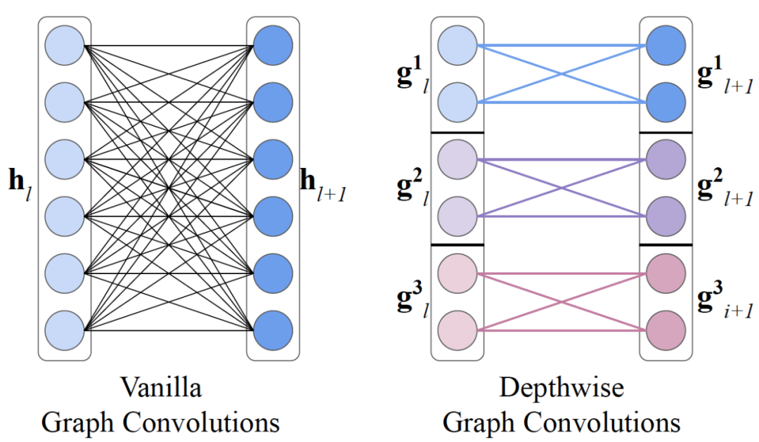 受分组卷积 [2] 的启发,我们提出了两种在图卷积网络上的拓展,即深度图分组卷积(Deepthwise Group Graph Convolution)和层级图分组卷积(Layerwise Group Graph Convolution).