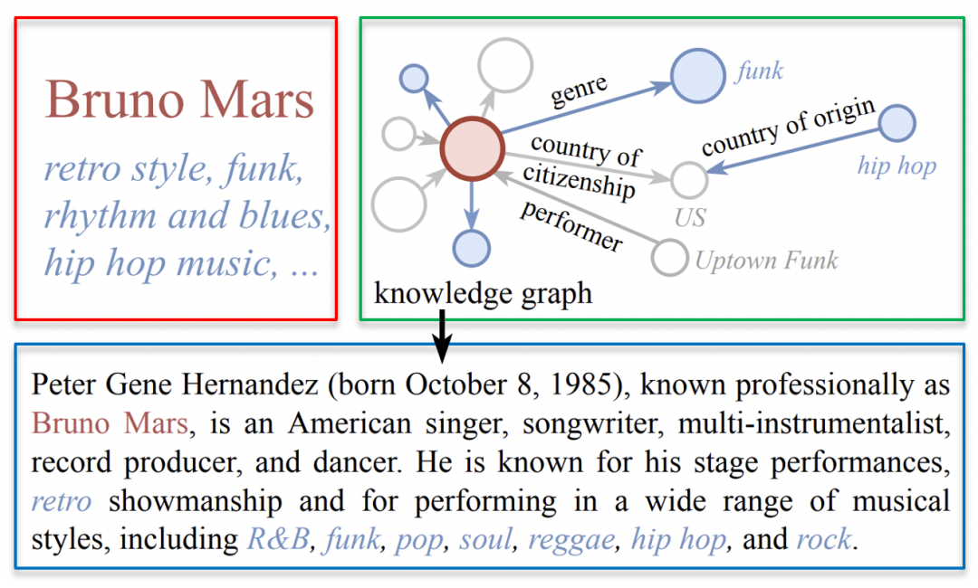 上图例子中,红色框内是输入的主实体(Bruno Mars)和多个附属主题实体(funk, rock, R&B 等),目标是生成符合这一特定主题的文本描述,如蓝色方框所示,来介绍 Bruno Mars 其人以及其音乐风格等。为了使生成的描述符合现实世界的知识,我们依据输入实体,有选择性地利用知识图谱中关于这些实体的知识,如绿色方框所示,辅助生成该实体的主题化描述。本任务相较于现有的生成任务更具有实用性和挑战性。