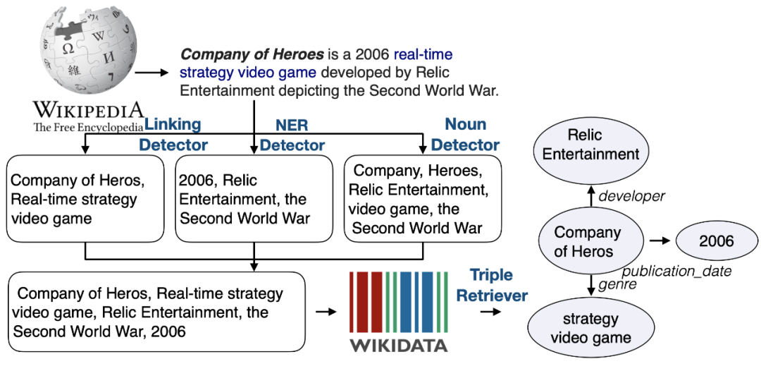 首先,我们提取出 Wikipedia 每篇文章的第一个句子,随后,我们用实体检测器(Entity Detector)来抽取出每个句子所包含的所有实体,该实体检测器包含三个部分,分别是链接检测,NER 检测以及名词检测,其中 NER 检测和名词检测通过 spaCy 实现。接着,这些名词经过一些规则过滤后,两两组合(笛卡尔积)得到了实体对(Entity Pair)的列表。