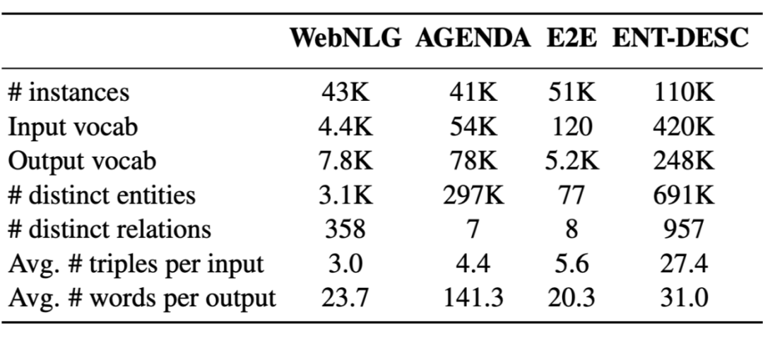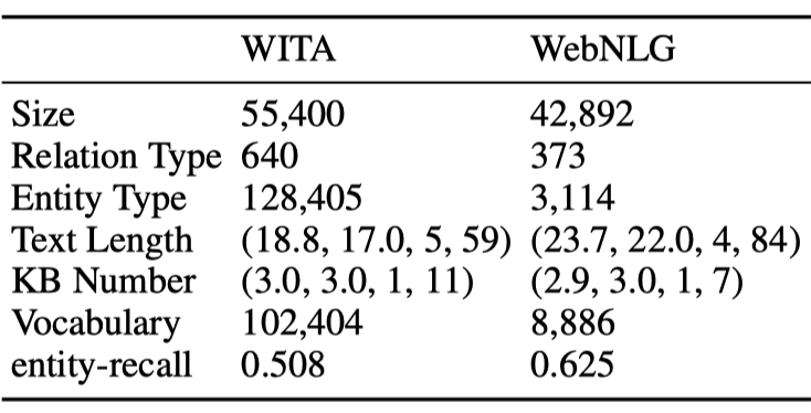 此数据集的一大特性为输入中包含输出内容以外的信息,因此要求模型可以有效选取输入中更为有用的信息去做生成。有关 ENT-DESC 数据集以及其更详细的准备和处理步骤可参阅: