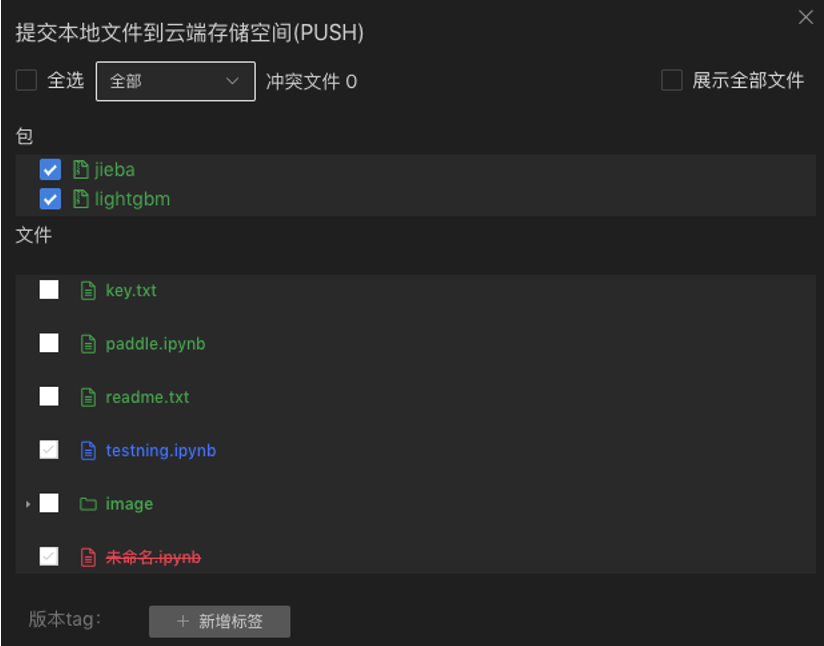 此外,BML CodeLab支持对代码、数据、模型等类型文件的版本控制;可通过不同文件颜色区分新建文件、已删除文件、已修改文件,方便用户监控文件变化,把控版本生成。