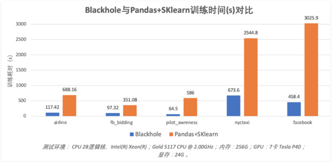 BML CodeLab内置了百度自研的高性能数据科学引擎Blackhole,利用单机GPU和CPU进行异构加速计算,相比开源Pandas/Sklearn性能可提升6倍以上,同时拥有处理10TB的单机超大数据处理能力,如下图对比结果: