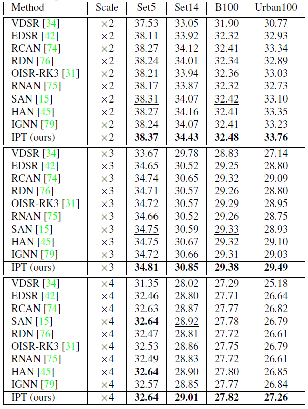 可以看出,IPT 模型在所有设定下均取得了最好的结果。尤其是在 Urban100 数据集上,对比当前最好的超分辨率算法,IPT 模型展现出了大幅度的优势。