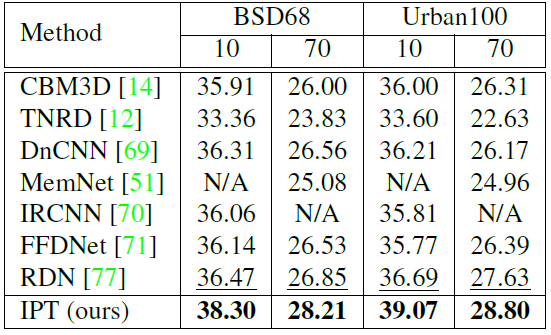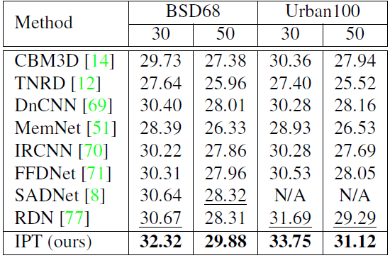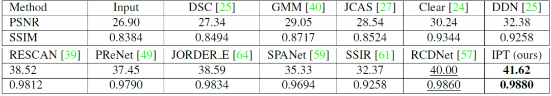 如表 2 和表 3 所示,在去噪和去雨任务上,IPT 模型也展现出了类似的性能。