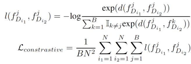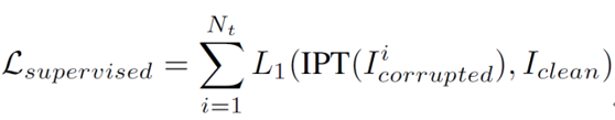 除此之外,为了提升模型在未曾预训练过的任务上的性能(如不同倍率的超分辨率、不同噪声强度的去噪任务),研究者根据特征块之间的相关性引入了对比学习方法作为自监督损失函数。具体来说,来自于同一图像的特征块之间的特征应当相互接近,来自于不同图像的特征块应当远离。这一自监督损失函数如下所示: