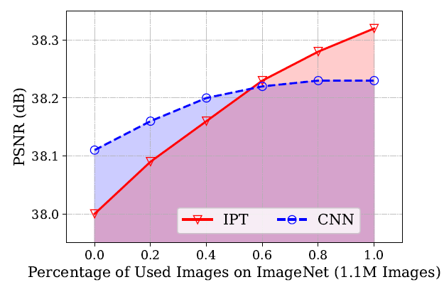 图 2:预训练数据量对 CNN 与 IPT 模型的影响。
