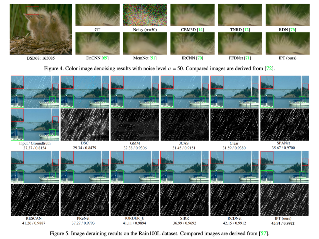 下图展示了不同方法在去噪、去雨任务中的处理结果,从中可以看出 IPT 模型的输出结果更接近真值图像: