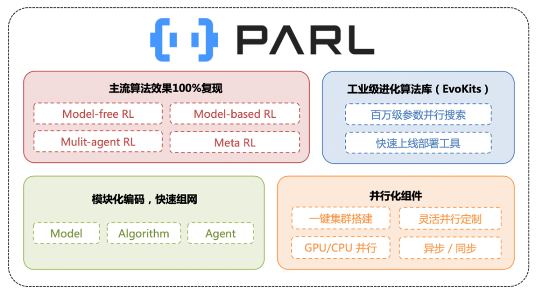 PARL 是基于百度飞桨深度学习平台(PaddlePaddle)自主研发的强化学习框架,汇聚了百度多年来在强化学习领域的技术深耕和产品应用经验。PARL 采用模块式的编码设计,已复现的算法覆盖了包括 Multi-gent、Model-based、Evolution Strategy 和 Distributed RL 等不同方向的主流强化学习算法。