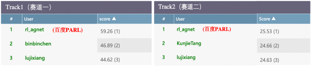 从官方榜单中可以看到,百度 PARL 团队拿下了两个赛道的冠军,在比赛阶段的公榜以及评估阶段的私榜上都名列第一,体现了强大的技术能力,以及针对实际场景的技术实用性。