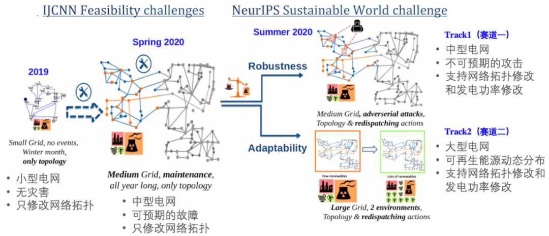 NeurIPS 2020 举办的电网调度赛事相比前两届的电网调度赛事具有更大的挑战难度,不仅电网规模更大,动作空间也更复杂,而且根据电网的真实场景,分别设置了更具有现实意义的鲁棒性(Robustness)和适应性(Adaptability)两个挑战赛道。两个赛道的设置分别如下: