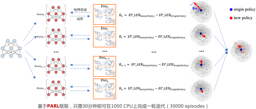 在大规模进化训练过程中,百度利用 PARL 高性能并行框架同时在上千 CPU 上对近 500 万参数的较大规模神经网络进行进化学习。在此过程中,需要先对网络参数进行不同的高斯噪声扰动,然后将扰动后网络作为专家系统新的动作打分模型,分别和电网系统进行交互,并计算噪声扰动后网络相比原始网络在电网系统中的平稳运行时长增益,作为该采样噪声的奖励 R;最后,整合不同噪声方向的奖励来决定下一轮网络参数的进化方向。