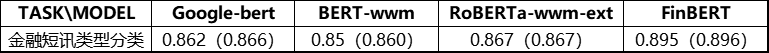 对比 FinBERT 和 Google 原生中文BERT、 BERT-wwm、RoBERTa-wwm-ext 这三种通用领域的预训练模型可知,FinBERT 效果提升显著,在 F1-score 上平均可以提升 2~5.7 个百分点。