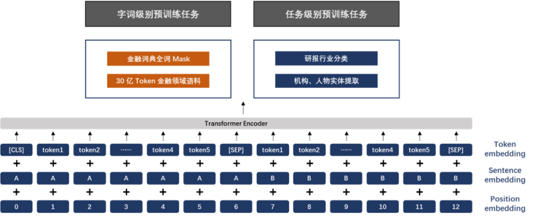 2、融合金融领域内知识。引入词组和语义级别任务,并提取领域内的专有名词或词组,采用全词 Mask 的掩盖方式以及两类有监督任务进行预训练;