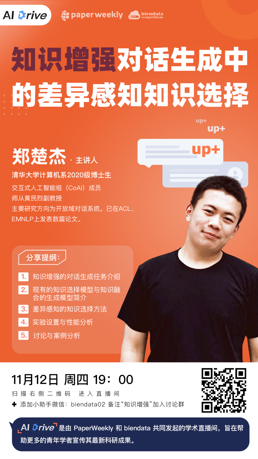 本期 AI Drive,我们邀请到清华大学计算机系博士生郑楚杰,为大家带来知识增强对话生成中的差异感知知识选择的专题直播。对本期主题感兴趣的小伙伴,11 月 12日(周四)晚 7 点,我们准时相约 PaperWeekly B 站直播间。