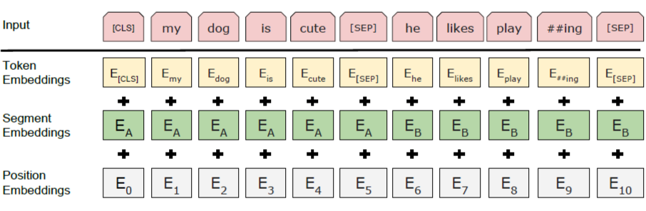 在 BERT 中,Token,Position,Segment Embeddings 都是通过学习来得到的,pytorch 代码 [5] 中它们是这样的: