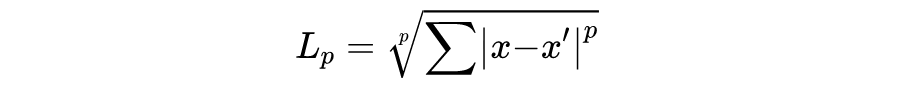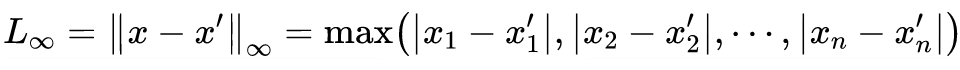 考虑到很难定义一个度量人类视觉能力的度量标准,p 范数最常用于测量插入到图像中的扰动的大小和数量。p 范数计算干净图像 与产生的对抗性样本 之间的输入空间中的距离 ,其中 ,具体距离计算公式如下所示: