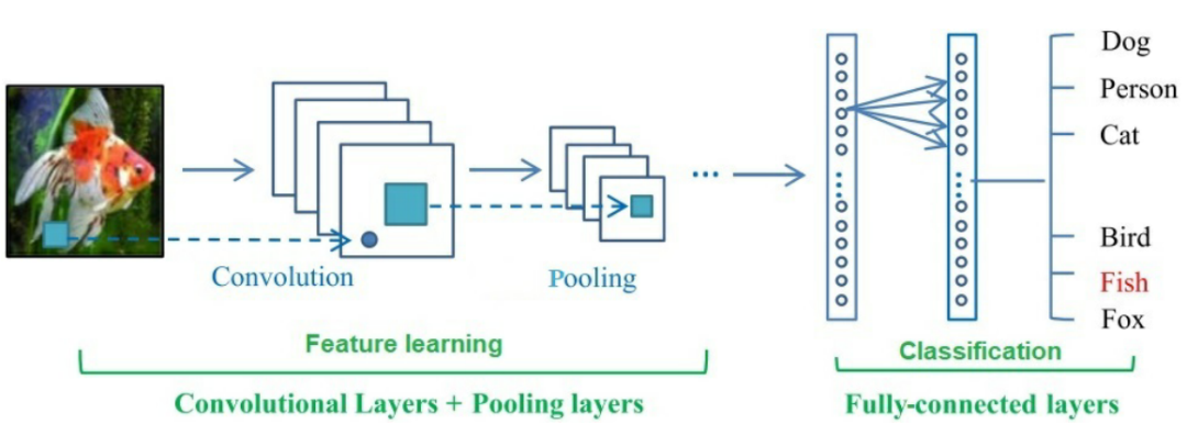 CNN 体系结构通常通过使用卷积层和池化层来执行特征学习,这些层分别从图像中提取有用的特征并降低其空间维数。在特征学习之后会连接全连接层。在分类任务中,会输出一个概率向量进行分类。如下图描述了一个 CNN 的标准架构示例。