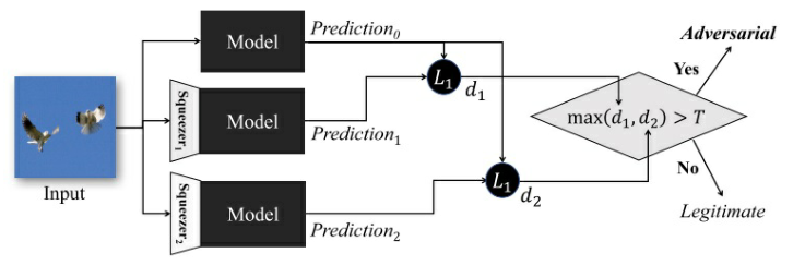 特征压缩是一种利用颜色位缩减和空间平滑来降低输入图像降维后的防御,它们通过处理两种不同类型的摄动来相互补充。位缩减的目的是通过覆盖不同像素来消除小扰动,而空间平滑则是通过覆盖一些像素来消除大扰动。如下图所示为具体的工作流程。