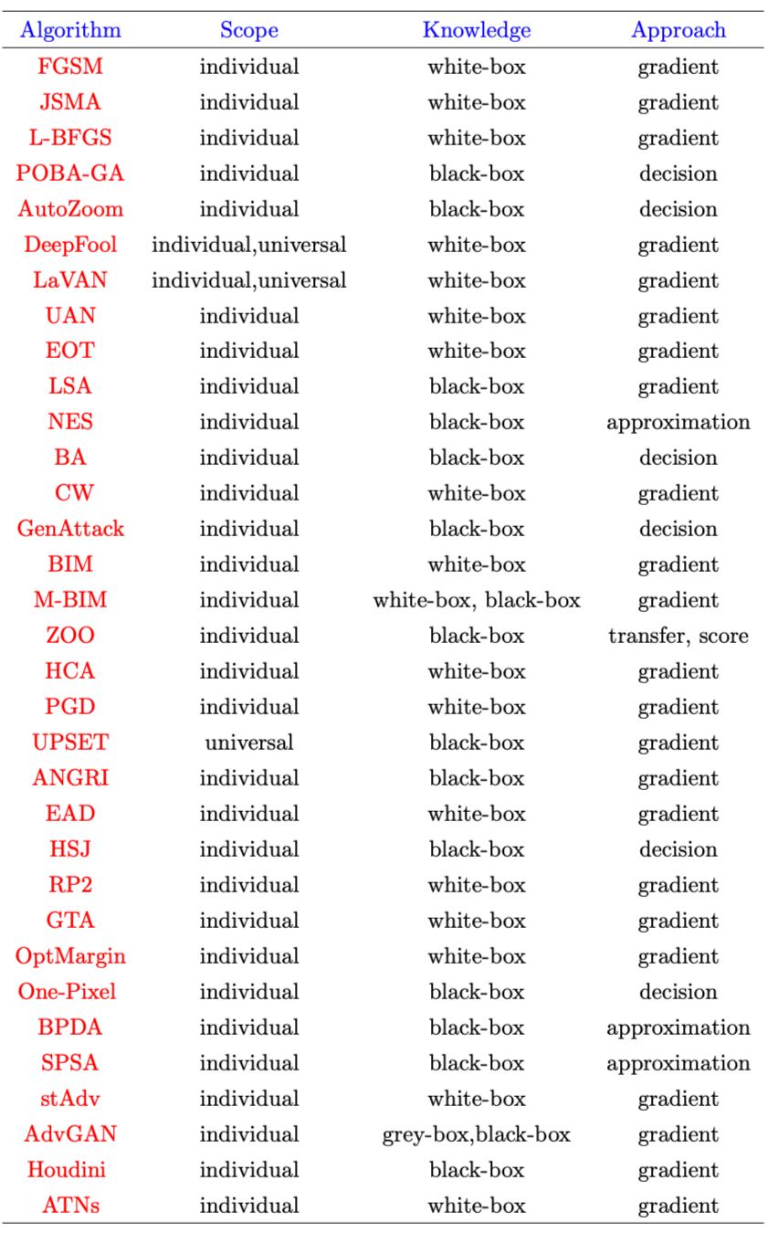 如下表所示,根据之前的一些划分方法将当前的对抗样本进行了一次完整全新的分类。(原表格非常的密集,字体非常的小,为了更够更清晰的展示出来,挑选了一些比较重要的分类指标并重新制作了一张表格。)