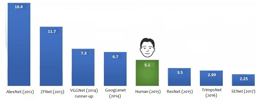 计算机视觉领域的一项重要竞赛被称为 ILSVRC(ImageNet 大规模视觉识别挑战赛),鼓励人们创建分类准确率更高的 CNN 架构。下图所示显示了 ILSVRC 挑战中的一些脱颖而出的 CNN 框架,分别是 AlexNet、ZFNet、VGGNet、GoogLeNet、ResNet、Trimpsnet2 和 SENet。并且自 2015 年以来,CNNs 已经超越了人类的表现。