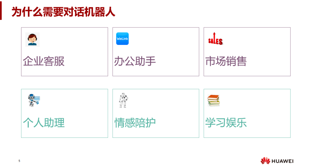其二是办公助手,像华为 Welink,即类似钉钉、微信、WeChat 一样的办公类软件,其实也有一部分可以去辅助人触达一些应用。这种办公类的助手,可以帮助订机票,新建日程。还有一个方向是市场销售,机器人也可以帮助企业做一些推销、销售、介绍产品。